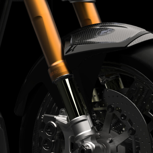 The 1s features the first single-sided swingarm from ARCH Motorcycle. Designed to be both functional and aesthetically appealing, the 1s swingarm follows our simple, elegant and efficient manufacturing philosophy. Functionality is improved via ease of maintenance and the rear carbon fiber wheel is unobstructed for visual appeal. Additionally, the swingarm works in conjunction with the Öhlins rear shock absorber to push the unsprung mass of the wheel and tire back to the road for a more responsive feel.