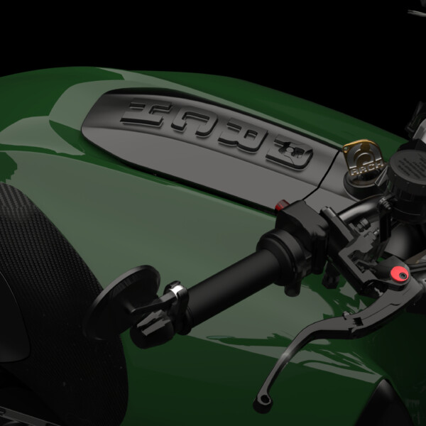 The ARCH 1s fuel cell is accessed through a cleverly hidden gas cap integrated into a hinged billet aluminum machined panel. With a turn of the flip-up latch the fuel cover opens providing easy access for refueling.