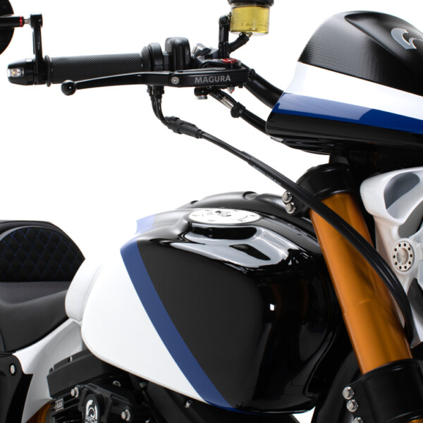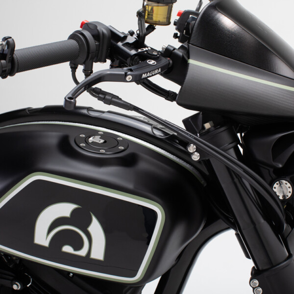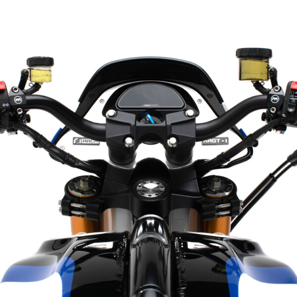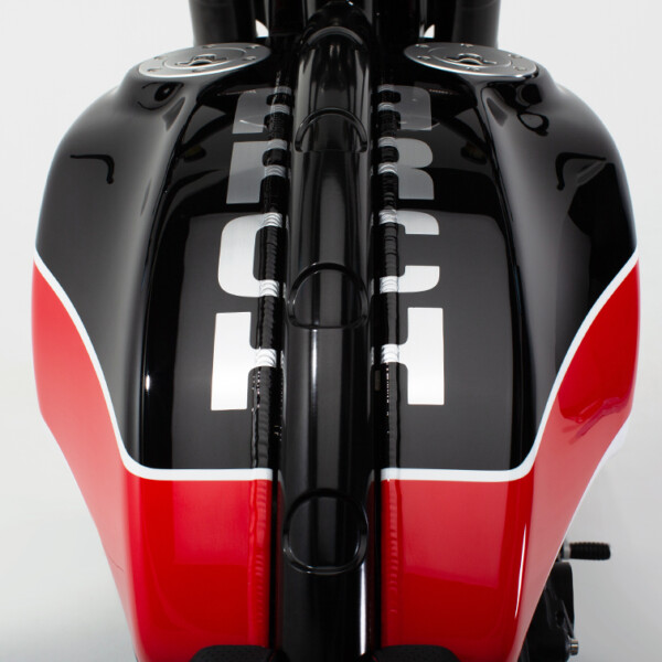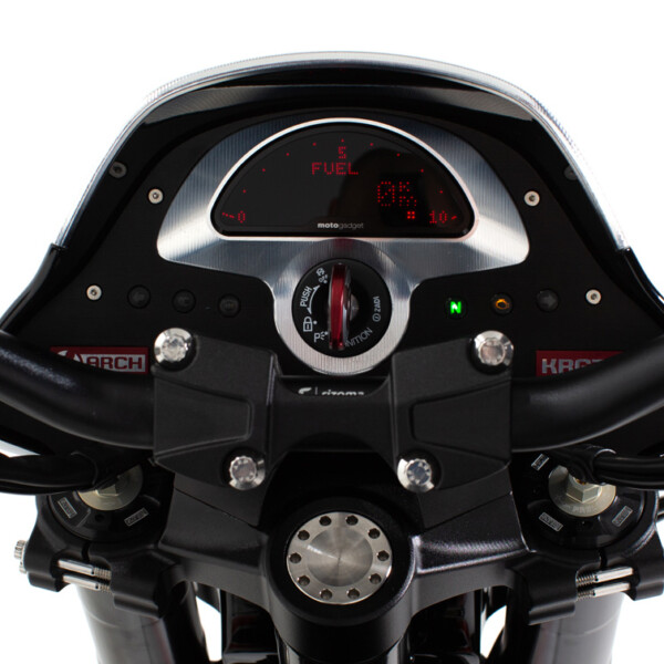 The ARCH KRGT-1 is defined by its agile yet planted handling characteristics. Billet aluminum components designed to serve multiple functions are employed to provide a rigid and more dynamic ride. The single-tube backbone frame is complemented by a machined billet aluminum fuel cell that acts as a stressed member and completes the chassis. A lightweight billet aluminum swingarm structure reduces unsprung weight allowing the rider to feel more connected with the road.